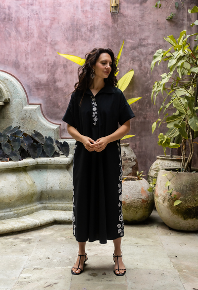 • Features intricate hand-embroidery along the collar and down the sides of the dress