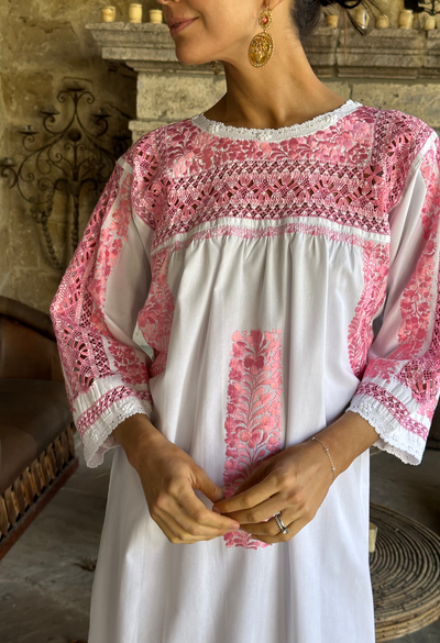 The Flores pieces come from the community of San Antonino Castillo Velasco. It is a community in Oaxaca that is known for its traditional floral hand embroidery, which dates back over 200 years.